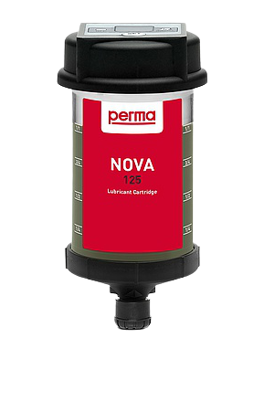 perma NOVA Automatyczne smarowniczki systemu perma NOVA mogą być stosowane we wszystkich aplikacjach w przedziale temperatury od -20°C do +60°C. Okres dozowania od 1 do 12 miesięcy jest łatwo ustawiany przyciskiem „selection” na wielokrotnego użytku kontrolerze dozowania. Czujnik temperatury reaguje na zmianę temperatury otoczenia zmieniając intensywność generowania gazu wywierającego ciśnienie na tłok wypychający środek smarny. Zapewnia to ciągłe i równe dozowanie stałej porcji środka smarnego. Oprócz wielokrotnie używanego kontrolera dozowania smarownica perma NOVA składa się z wymiennego zbiorniczka ze środkiem smarnym i z pokrywki ochronnej. perma NOVA dostępna jest w 2-ch wielkościach: 65 cm³ i 125 cm³.