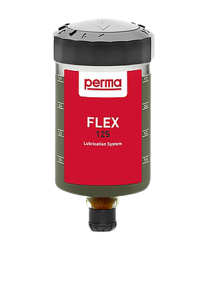 perma FLEX Automatyczne smarowniczki systemu perma FLEX dostępne w 2-ch pojemnościach (60 cm³ i 125 cm³) zostały zaprojektowane specjalnie do stosowania w niewielkich i ograniczonych przestrzeniach. Mogą być stosowane zarówno w pomieszczeniach, jak i na zewnątrz w zakresie temperatur od -20°C do +60°C. Okres dozowania smaru można dowolnie ustawiać od 1 do 12 miesięcy za pomocą pokrętła znajdującego się w górnej części smarownicy. perma FLEX dostarczana jest jako jeden kompletny element i od razu jest gotowa do użycia. Proste przekręcenie włącznika i ustawienie go na pożądanym okresie dozowania sprawia, że smarownica zaczyna pracować. Elektronicznie sterowana reakcja chemiczna wytworzy ciśnienie, które jest niezbędne, aby w sposób ciągły dozować środek smarny do punktu smarowniczego.