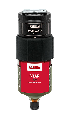 perma STAR VARIO Automatyczne smarowniczki systemu perma STAR VARIO bardzo precyzyjnie dozują smar zgodnie z ustawionymi dawkami niezależnie od temperatury otoczenia. System składa się z wielokrotnego użytku napędu elektromechanicznego, wymiennego zbiornika ze środkiem smarnym o pojemności 60 cm3, 120 cm3, 250 cm³ lub 500 cm3 oraz kompletu baterii. Żądany okres dozowania i rozmiar posiadanego zbiornika można łatwo wybrać za pomocą przycisków nastawnych w napędzie i są natychmiast widoczne na wyświetlaczu LCD. Aktualny stan pracy jest wskazywany na wyświetlaczu LCD oraz za pomocą lampek sygnalizacyjnych LED (czerwona / zielona) widocznych dookoła napędu.